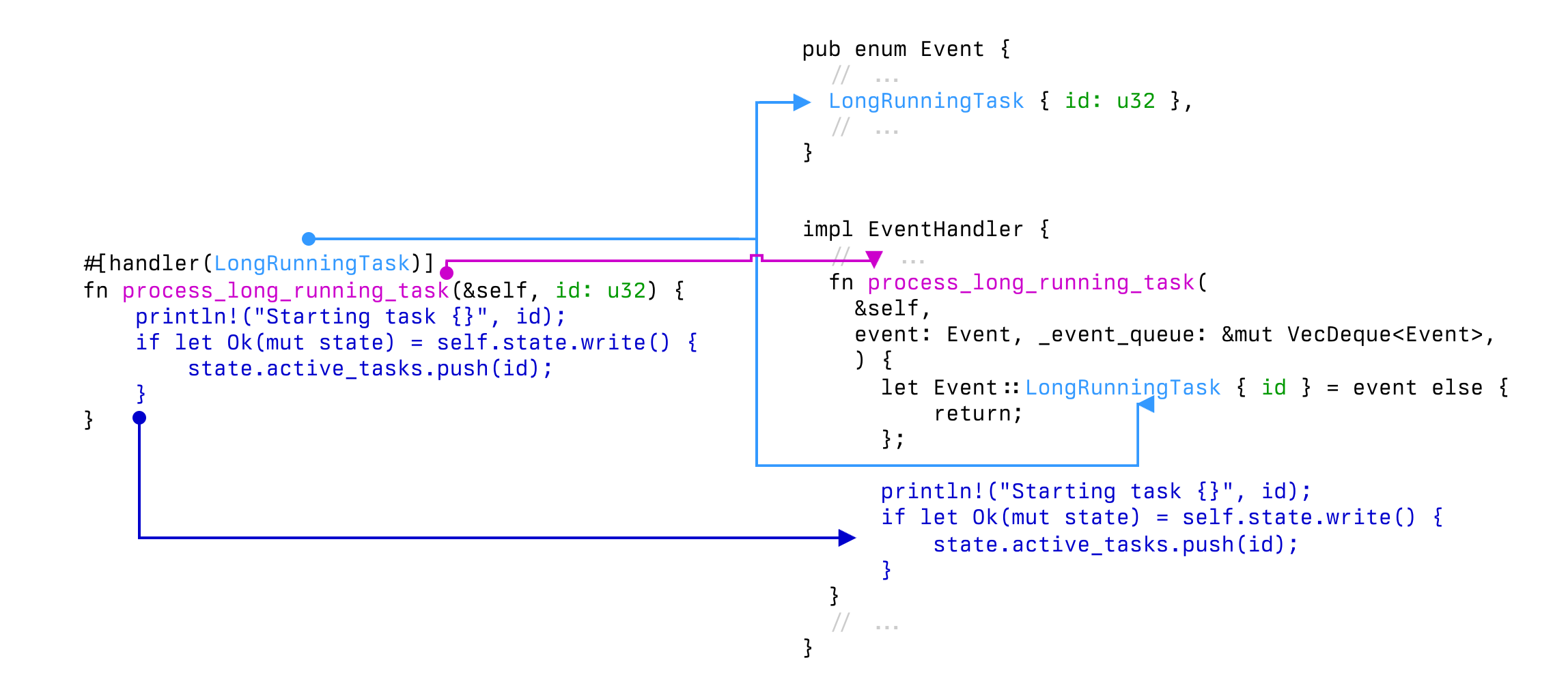 When switching to proc-macros an interesting part is that processor functions are perfectly valid ones! rust-analyzer sees input and output types. I also do some magic (that I don’t like but hey…): when EventEnvelope or VecDeque<EventEnvelope> is in function inputs I forward the variable name to body processing, i.e.
